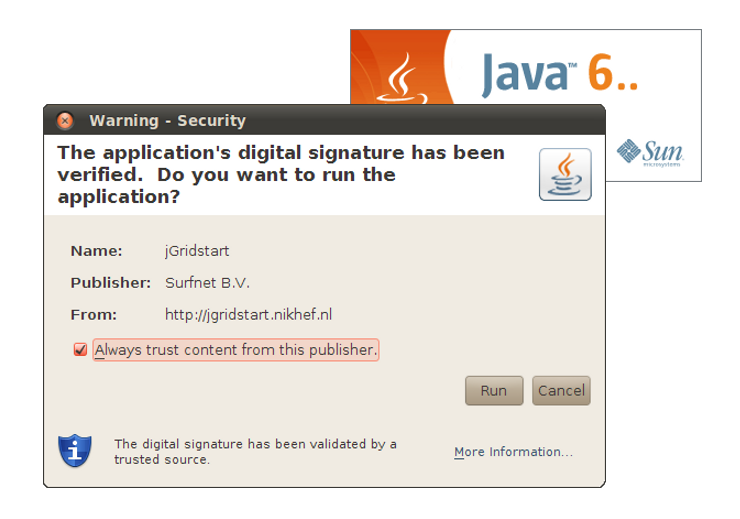 To request a new certificate and to manage your request, a Java program needs to run with access to your computer; you need to grant the required access to continue. Documentation is available at jGridstart help: |